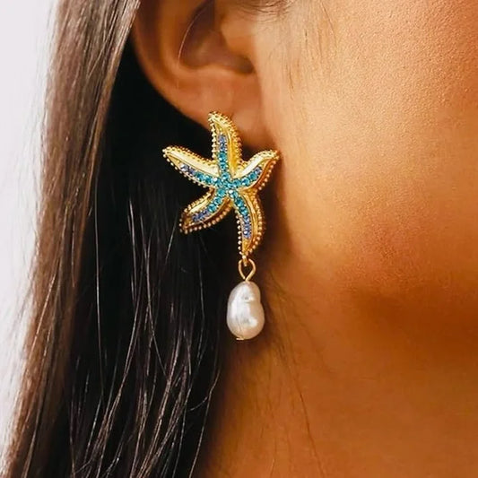 ESTRELLA DE MAR Gold Starfish Earrings with Blue Crystals and Pearl Drops