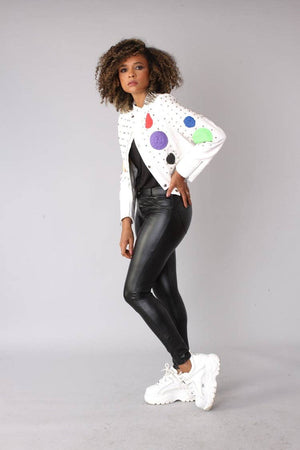 Elevate your style with this striking NYC-inspired studded jacket crafted from innovative vegan leather. The bold multi-color design and edgy stud detailing make a confident statement, while the sustainable material lets you look amazing without compromise. Perfect for anyone who wants fashion with a conscience—rock that rebellious edge knowing you're making a compassionate choice. This jacket pairs effortlessly with everything from casual tees to dress-up looks, giving you versatile style that feels authentically you.