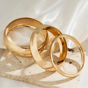 Elevate your ensemble with this chic gold bracelet trio. These stunning pieces bring a touch of luxury to any outfit.