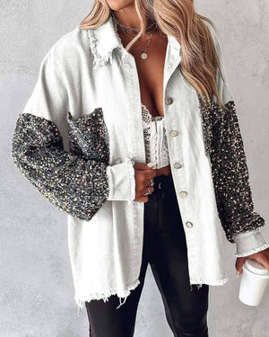 This chic jacket features a colorblock design with contrasting sequins and a raw hem for a stylish touch. Crafted from 100% polyester, it has a turn-down collar and long sleeves, offering a comfortable, regular fit with slight stretch. Perfect for everyday wear, this piece requires gentle care—hand wash only and avoid dry cleaning—to maintain its quality.