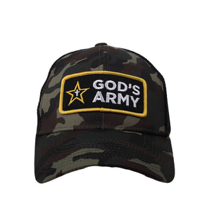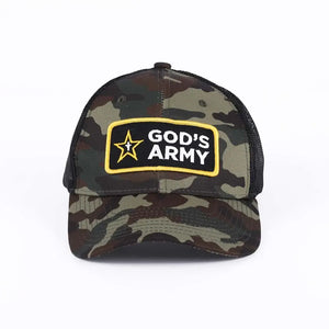 Check out our stylish and versatile trucker caps - a perfect blend of comfort, functionality, and style. Carefully crafted from durable acrylic fabrics, this cap is engineered for longevity, ensuring it withstands the test of time while maintaining its vibrant appeal. Acrylic fabric is renowned for its durability, making this cap a reliable companion for all your adventures. Designed with a classic camo front panel and a breezy black mesh back, this cap strikes the ideal balance between a classic aesthetic and modern flair. The centerpiece of this cap is the intricately embroidered patch proudly displaying the phrase "God's Army" in crisp black and white with a touch of bright yellow. The detailed embroidery not only adds texture and definition but also lends a touch of individuality and style to your look.